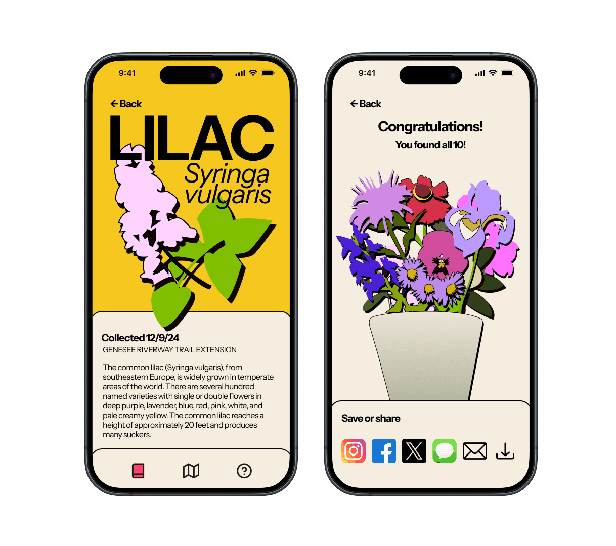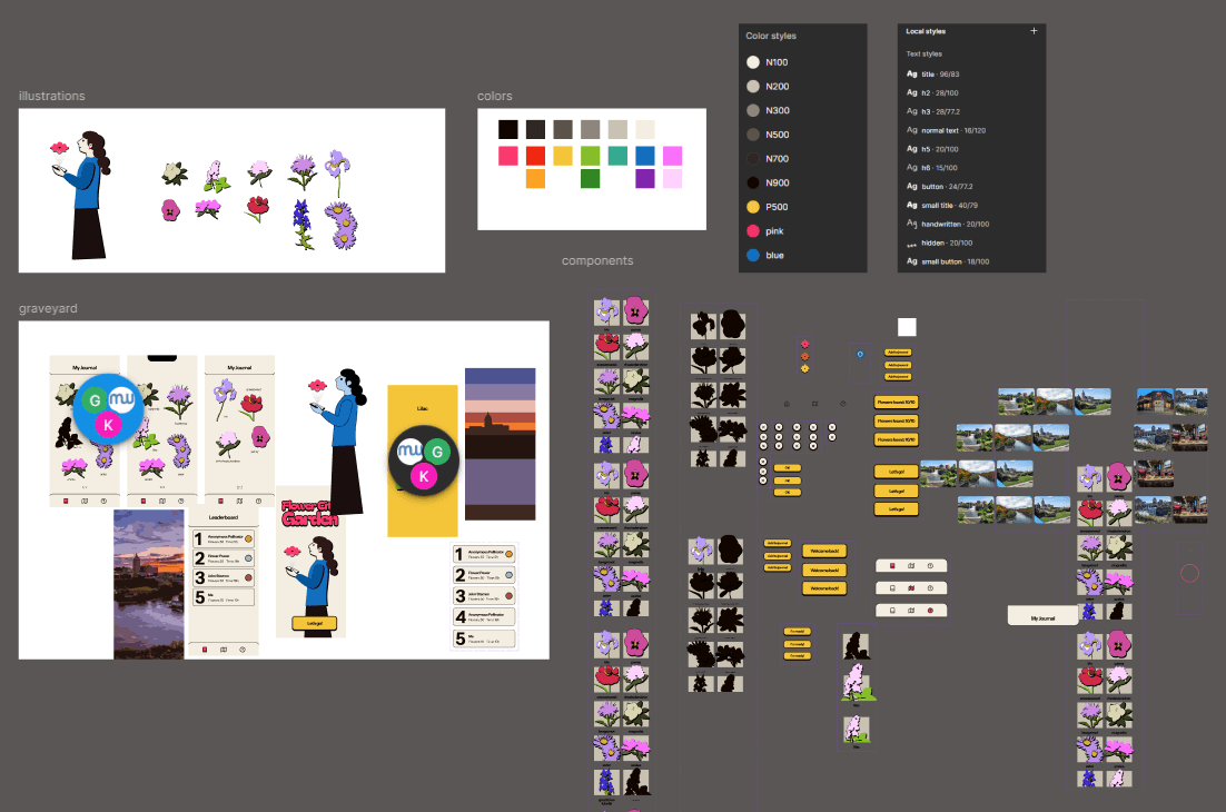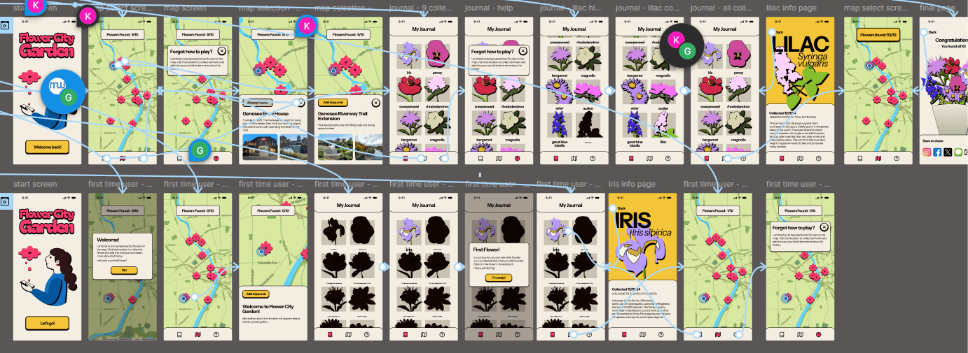 The map and location functions were critical because they needed to look and function in a way that was different from competitors like Google Maps in order to keep users on the app. I kept iterating until I found a good balance between fun and function. The colorful UI and use of flowers as pins keeps users engaged and looking forward to learning about each flower they find, especially with the addition of the bouquet when all of the locations are visited. Ultimately, this app would lead to real-world engagement and strengthen Rochester’s community, furthering the goals of ROC the Riverway and getting people outside.
