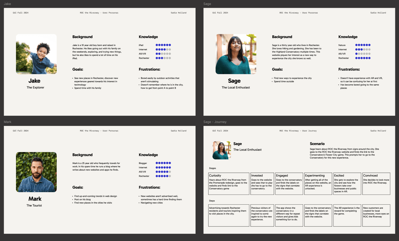 Defining the scope was one of my biggest challenges. I had to decide whether my experience would encompass the entire city or focus on an interaction with a single landmark. With so many possible routes, it was hard to choose just one, especially as someone who isn’t from Rochester and isn’t familiar with the city. I decided to build off of my own confusion and create something that would put ROC the Riverway into perspective for visitors like myself while making it fun for locals at the same time.