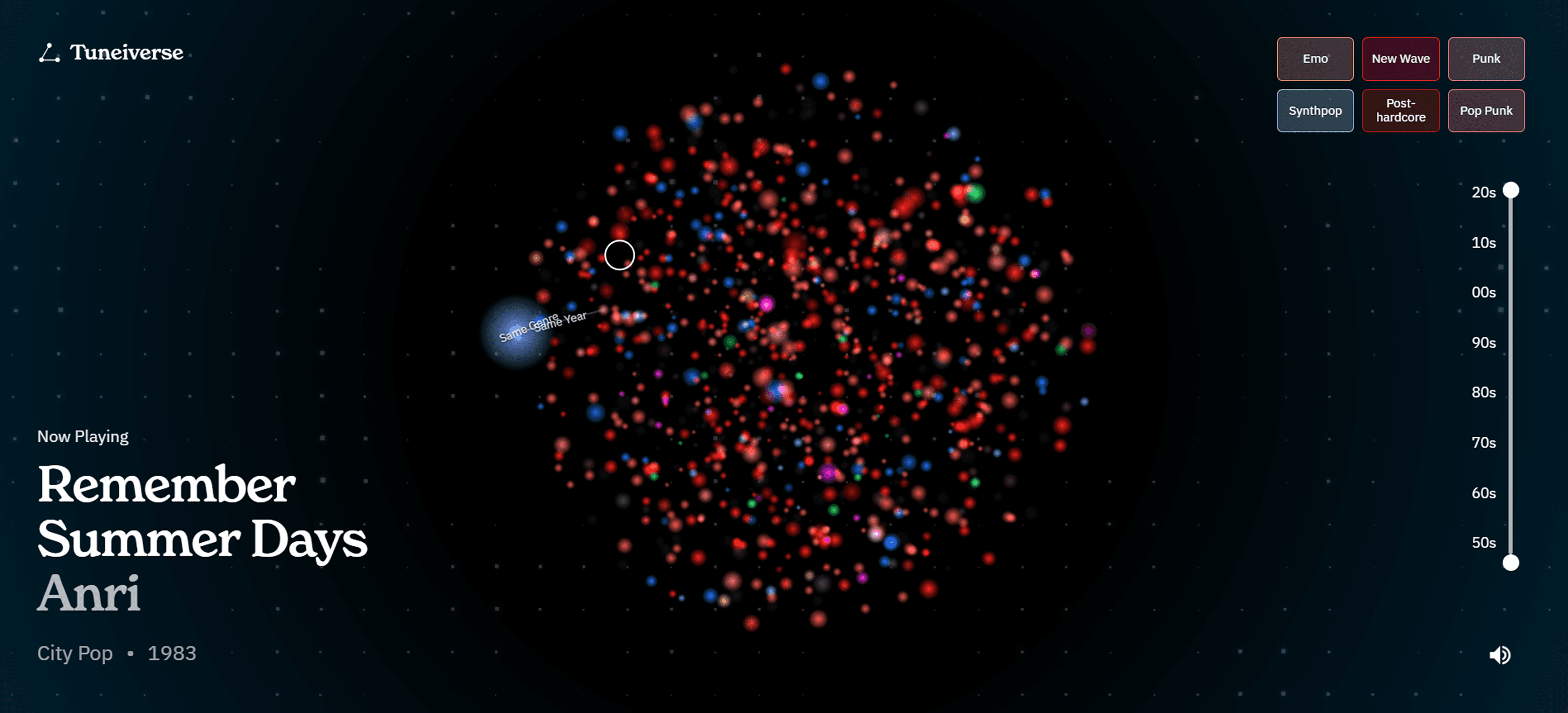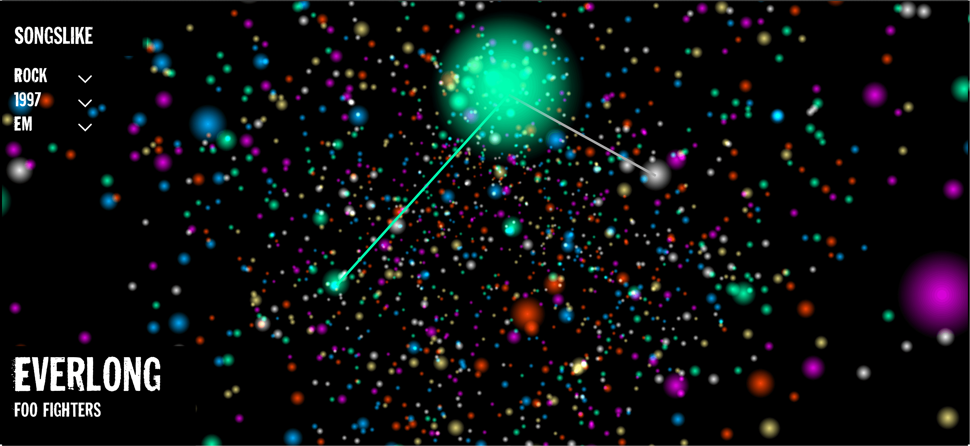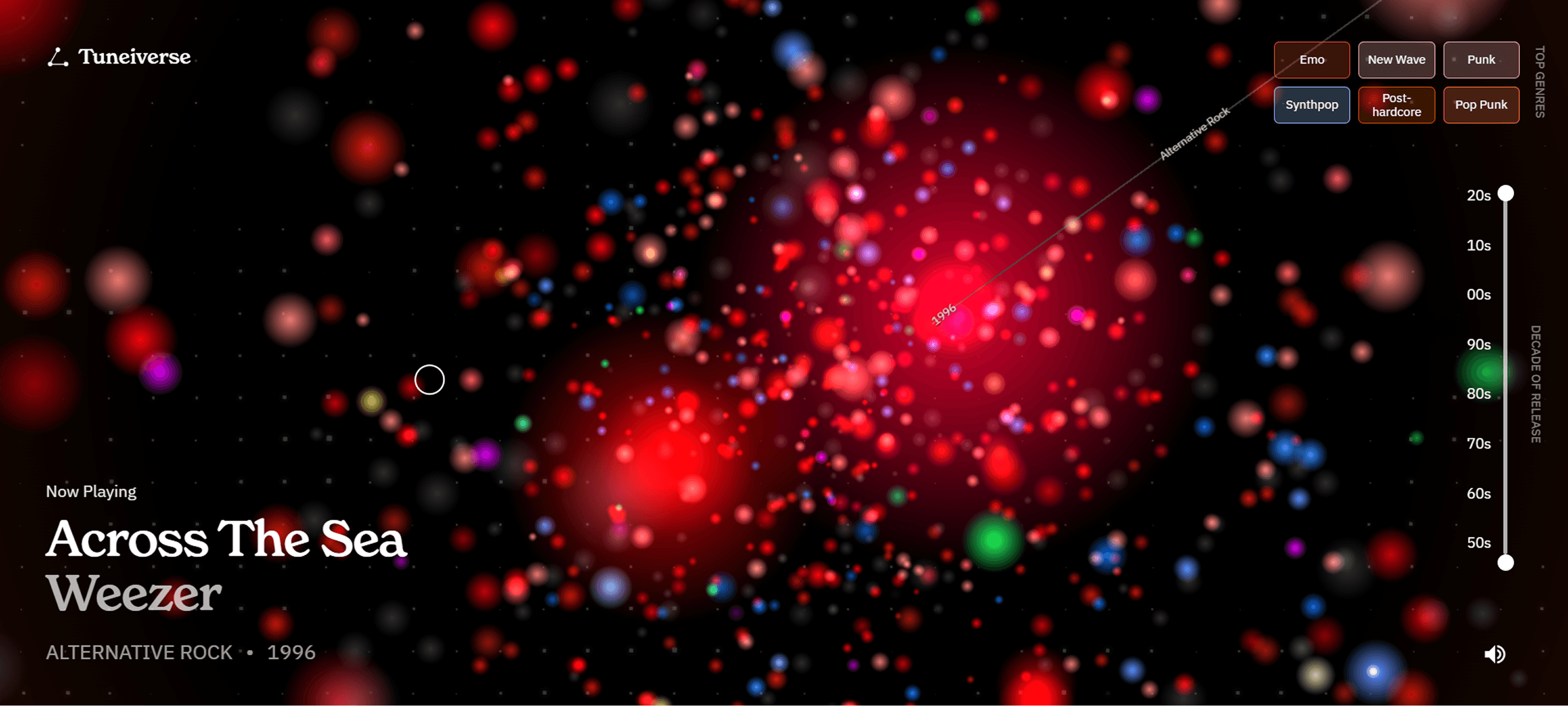 Tuneiverse is an AI powered song visualizer that takes your Spotify data to the next level. You can see what songs you listen to, how they relate to others you like, and filter by year and genre.