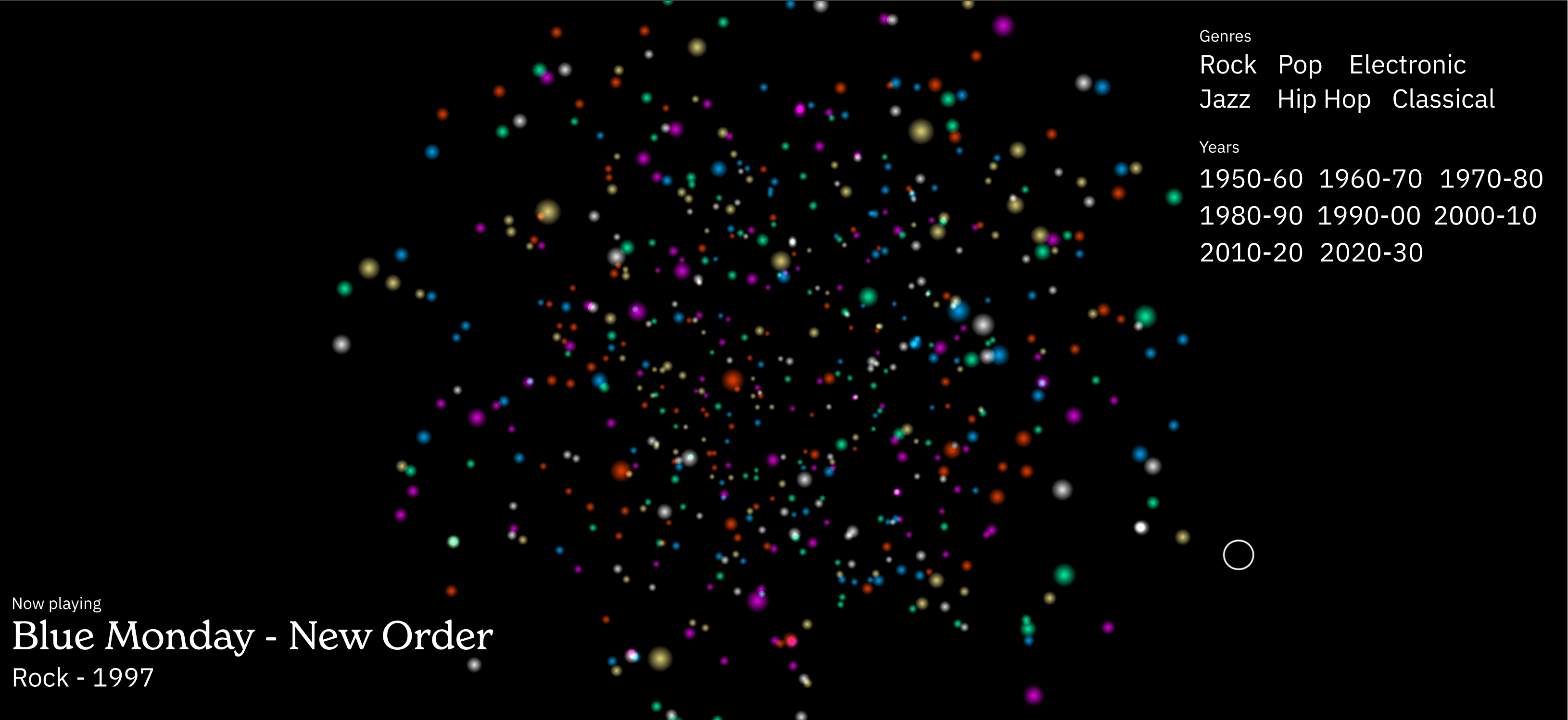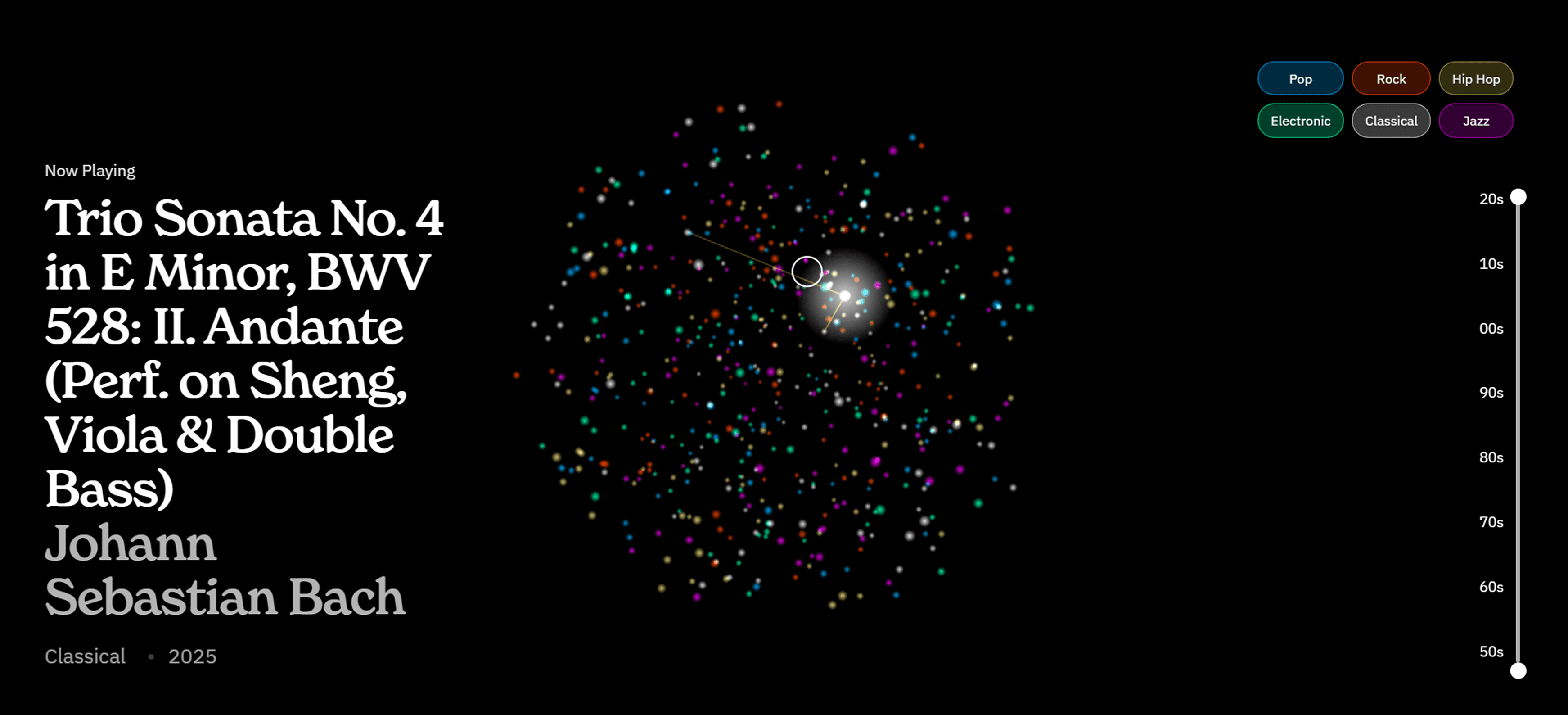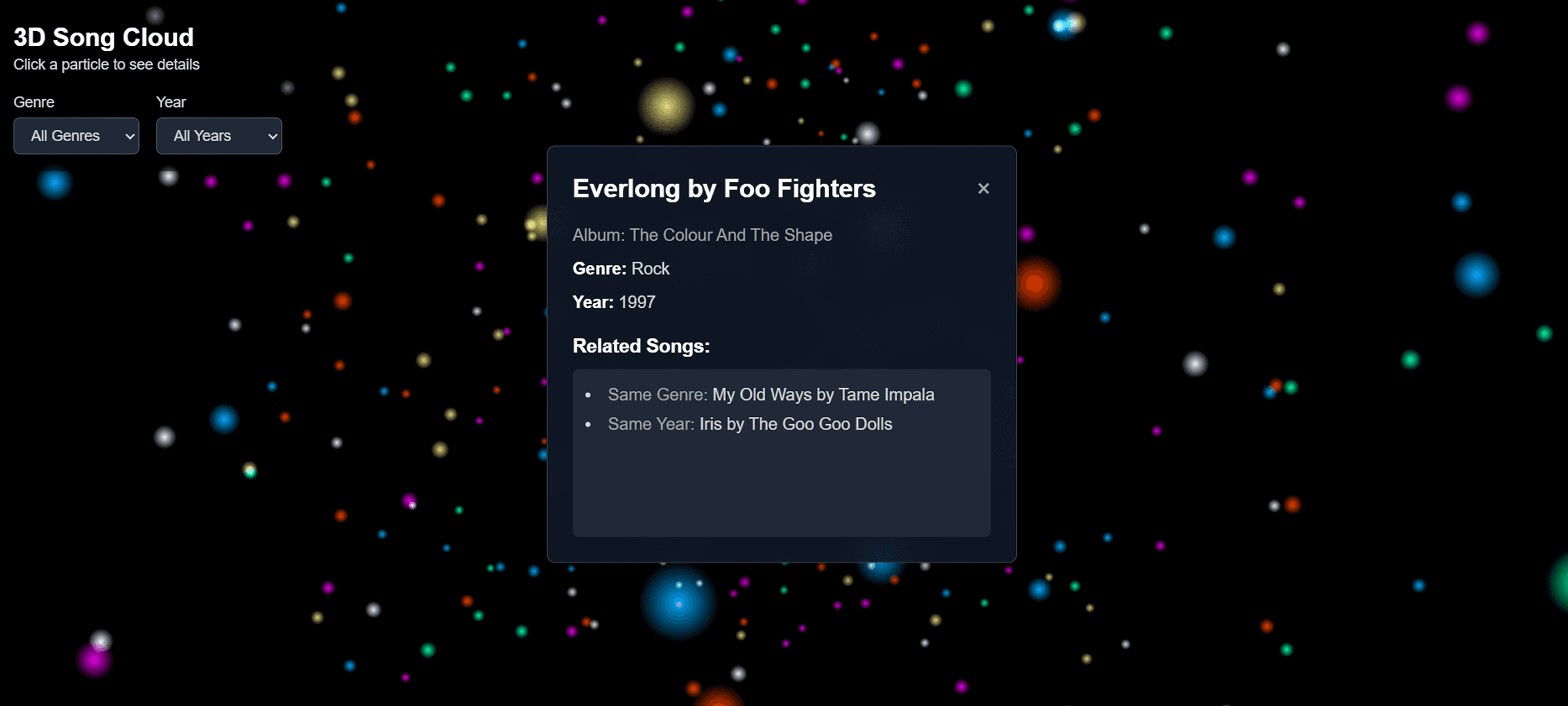 Tuneiverse is an AI powered song visualizer that takes your Spotify data to the next level. You can see what songs you listen to, how they relate to others you like, and filter by year and genre.
